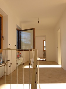 Die gelbe Ornamentverglasung im Flur wird klar verglast und und unterstützt mit einem massiven und geölten Eichenboden die helle und freundliche Atmosphäre.