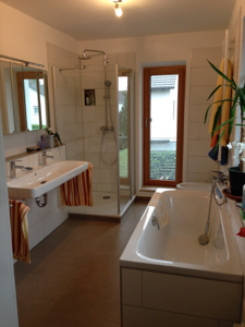 Ein neues raumhohes Fenster, die abgesetzte Badewanne und eine verglaste Dusche öffnen den Raum.
