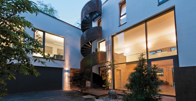 Die Flachdächer sind über eine Wendeltreppe aus Corten-Stahl mit dem Innenhof verbunden. EIne wassergebundene Basaltschüttung und eine japanisch beeinflusste Gartengestaltung machen den Hof zu einer innerstädtischen Oase.