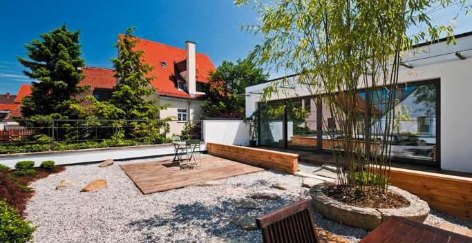 Das neu angehobene Dachgeschoss und großzügige Schiebfenster geben der bestehenden Terrasse eine neue Qualität.